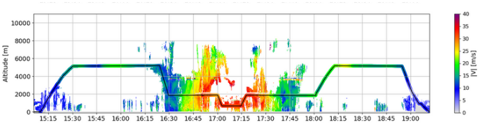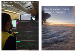 En parallèle, les instruments mesurant le vent montrent une augmentation de sa vitesse, atteignant par endroit 35 m/s, encore plus marqué quand l’ATR fait un leg parallèle au vent dans la couche limite autour de 600 m. Le leg retour montrent aussi des vents forts, un deuxième passage dans l’oeil qui s’est advecté à l’ouest avant de repasser dans la partie nord avec une baisse de vent ! Un bel échantillonnage de la tempête. Une inconnue reste encore à déterminer plus tard… En effet, en sortant des nuages s’enroulant autour du centre, 11 m/s de vent vertical négatif a été mesuré avec une baisse brutale de l’altitude de vol.